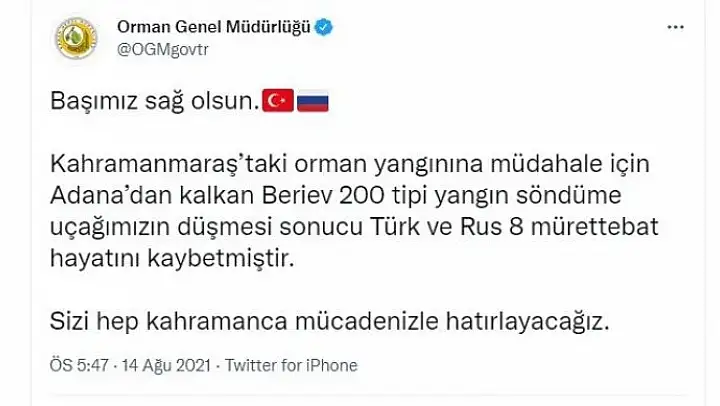Orman Genel Müdürlüğü´nün (OGM) Twitter´daki hesabından Kahramanmaraş´ta düşen yangın söndürme uçağına ilişkin açıklama yapıldı. Açıklamada, 'Kahramanmaraş´taki orman yangınına müdahale için Adana´dan kalkan Beriev 200 tipi yangın söndürme uçağımızın düşmesi sonucu Türk ve Rus 8 mürettebat hayatını kaybetmiştir. Sizi hep kahramanca mücadelenizle hatırlayacağız' ifadelerine yer verildi.