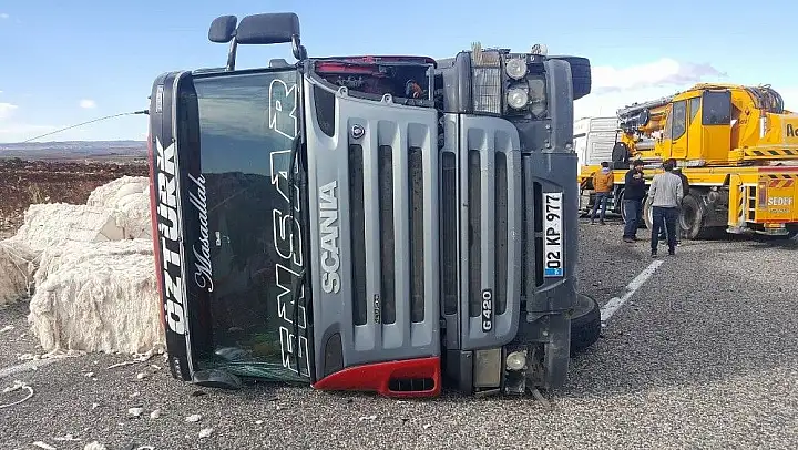 Adıyaman'da, sürücüsünün direksiyon hakimiyetini kaybettiği pamuk yüklü tırın devrilmesi sonucu 1 kişi yaralandı.