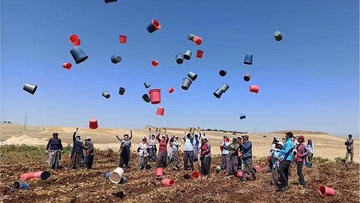 Tarım işçileri, günün sonunda patates topladıkları kovaları toplu olarak havaya fırlatarak günü bitirmenin mutluluğunu yaşadı.