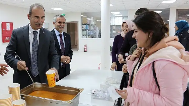 Sivas Cumhuriyet Üniversitesi'nde (CÜ) vize sınavlarının başlaması dolayısıyla öğrencilerin ders çalışmalarını desteklemek için 'Çorba Bizden Çalışma Sizden' sloganı ile çorba ikram ediliyor.