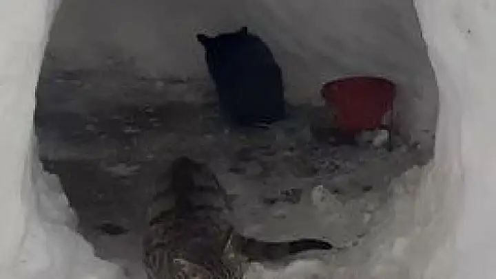 Adıyaman´ın Kahta ilçesinde 2 gündür devam eden kar yağışından dolayı iki kardeş, kardan kedi evi yaparak kedileri soğuktan korumaya çalıştı.