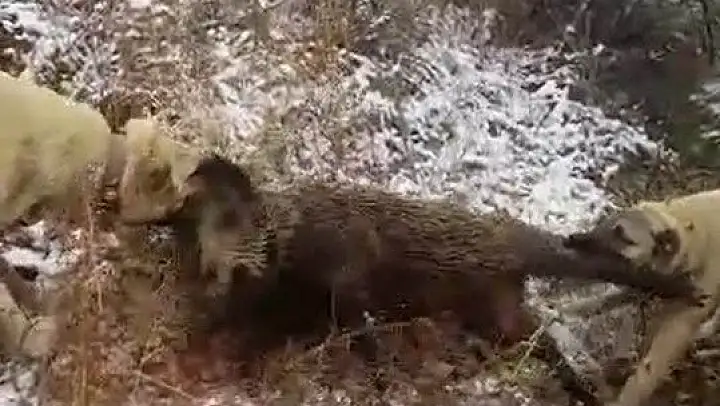 Sivas'ın merkeze bağlı Hasbey köyünde sürüye saldıran yaban domuzunu kangal köpekleri yakalayarak telef etti.