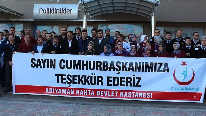 Kahta Devlet Hastanesinde çalışan taşeron işçiler, 'sürekli işçi' kadrosuna geçişlerinden dolayı Cumhurbaşkanı Erdoğan'a teşekkür etmek amacıyla basın açıklaması yaptı.