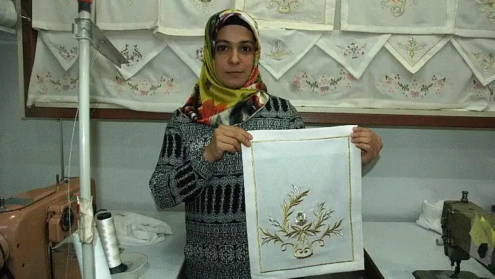 Ortalama 15-20 bin iğne vuruşuyla ortaya çıkan sim sırma işlerinin özellikle yeni evlenecek çiftlerin yoğun ilgisiyle karşılaştığını kaydeden Merve Ekici, 'Yaptığımız zor bir iş ama isteyen bütün kadınlar yapabilir ve para kazanabilir' dedi.