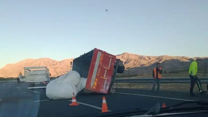 Olay, Elazığ-Bingöl karayolu 23´üncü kilometrede meydana geldi. Edinilen bilgiye göre, plakası ve sürücüsü belirlenemeyen küspe yüklü traktör, seyir halindeyken römorkunun arka sol tekerinin yerinden çıkması üzerine yan yattı. Traktörün römorkunda yüklü olan küspeler ise yol kenarına devrildi.