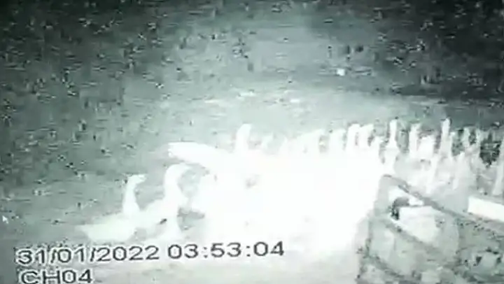 Güvenlik kamerasına yansıyan görüntülerde ise tilkinin kaz sürüsüne saldırması, korkan hayvanların ise avlunun bir köşesinden diğerine kaçışması yer aldı.