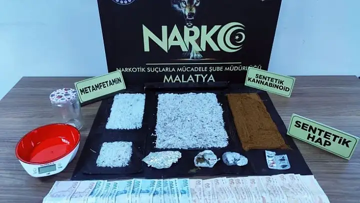 Edinilen bilgiye göre, Malatya Emniyet Müdürlüğü Narkotik Suçlarla Mücadele Şube Müdürlüğü görevlilerince torbacı olarak tabir edilen sokak satıcılarına yönelik operasyon düzenlendi. Yapılan çalışmada, 500 gram Metamfetamin, 124 gram Sentetik Kannabinoid, 2 adet yeşil receteye tabi hap, 1.2 gram Esrar, 1 adet hassas terazi ele geçirildi.