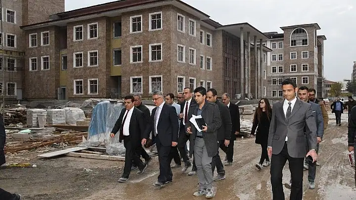 Yeni Hükümet Konağı inşaatını inceleme sırasında Vali Aykut Pekmez'e Vali Yardımcısı Adem Kaya, İl Özel İdare Genel Sekreteri Sami Işık ve şantiyenin teknik elemanları eşlik etti.