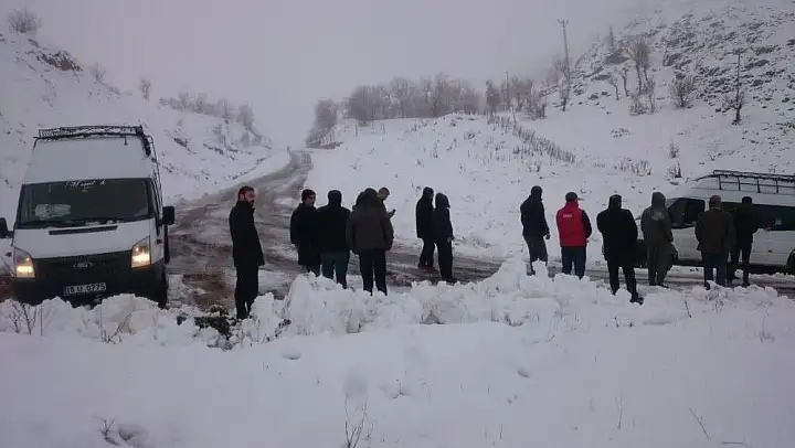 Adıyaman'ın Kahta ilçesinde kar nedeniyle yolda mahsur kalan servis minibüsündeki öğretmenlerin yardımına köylüler yetişti.
