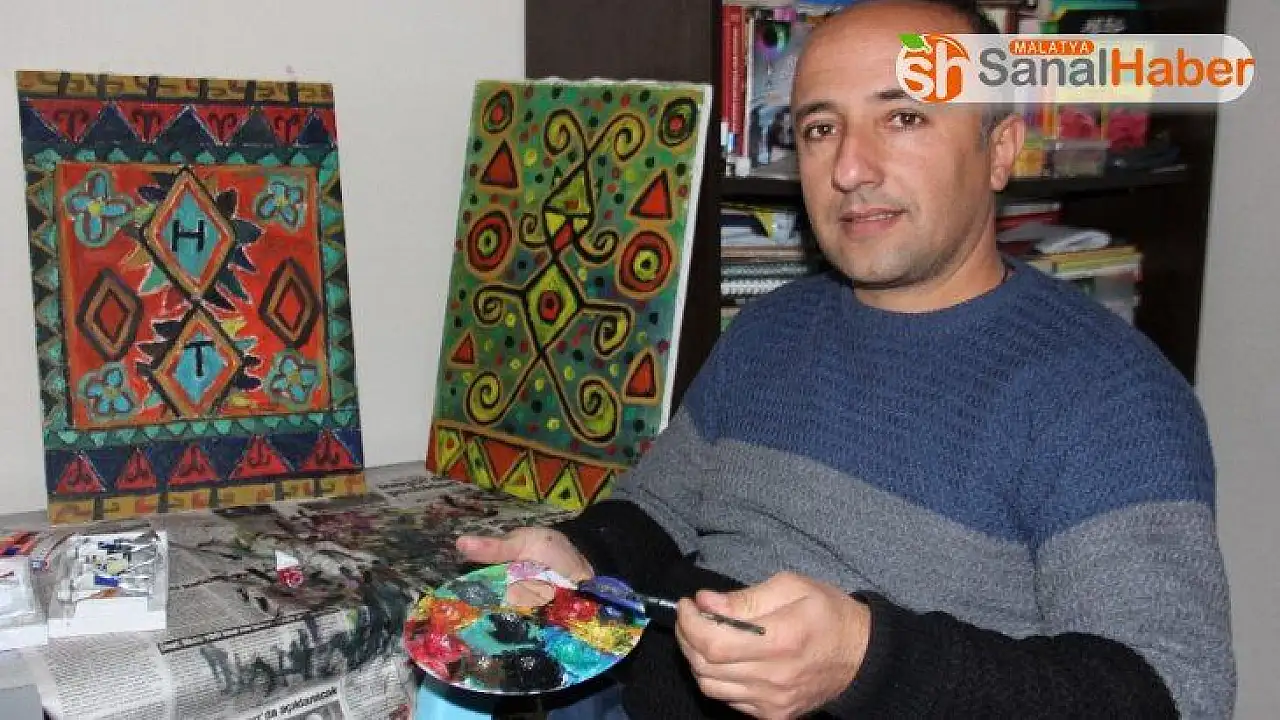 Adıyaman’da 2 şiir kitabı bulunan elektrik ustası Hüseyin Turhal, yaptığı resimlere Anadolu motiflerini fırça darbeleriyle işliyor.
