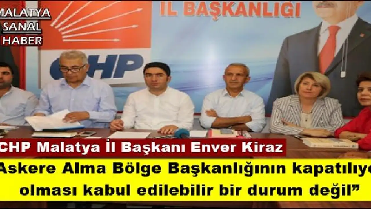 CHP Malatya İl Başkanı Enver Kiraz, Malatya'daki Askere Alma Bölge Başkanlığının kapatılmasının söz konusu olduğunu belirterek, “Askere Alma Bölge Başkanlığının kapatılıyor olması kabul edilebilir bir durum değil” dedi.