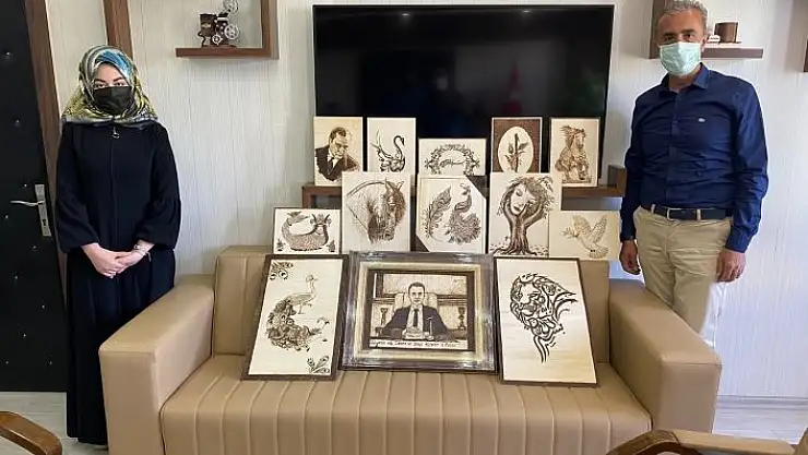 Semanur Aktan, Sosyal Hizmetler il Müdürü Fehmi Çelik´i makamında ziyaret ederek yaptığı eserlerden hediye etti.