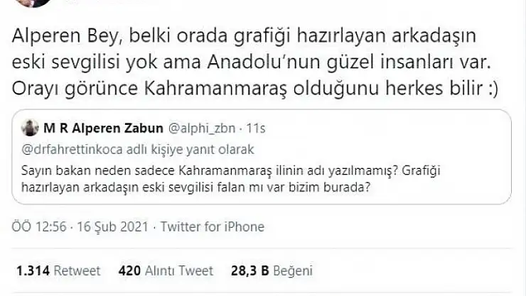 Sağlık Bakanı Fahrettin Koca, 81 ilin vaka tablosunda Kahramanmaraş´ın ismine yer verilmemesi üzerine "Grafiği hazırlayan arkadaşın eski sevgilisi falan mı var bizim burada" diye soran vatandaşa, "Orada eski sevgilisi yok ama Anadolu´nun güzel insanları var" şeklinde esprili cevap verdi.