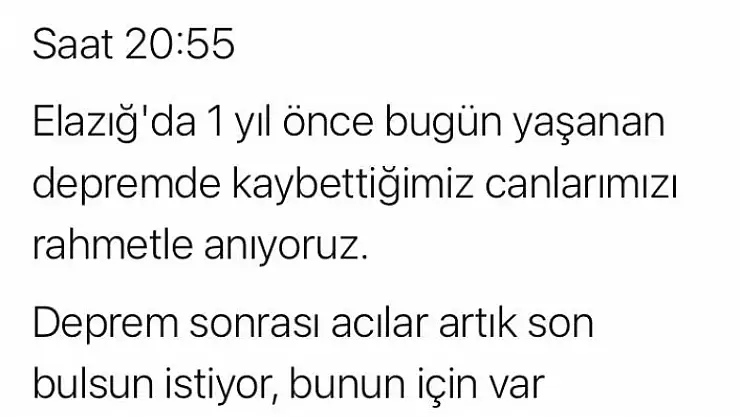 Yapılan deprem konutlarını incelemek üzere Elazığ´da bulunan Çevre ve Şehircilik Bakanı Murat Kurum, Twitter hesabından paylaşım yaptı. Bakan Kurum geçtiğimiz yıl bugün Elazığ´da yaşanan depremi anımsattığı paylaşımında, "Elazığ´da 1 yıl önce bugün yaşanan depremde kaybettiğimiz canlarımızı rahmetle anıyoruz. Deprem sonrası acılar artık son bulsun istiyor, bunun için var gücümüzle çalışarak ülkemizi depremlere hazır hale getiriyoruz. Güvenli yarınlar için bu son olsun" ifadelerini kullandı.