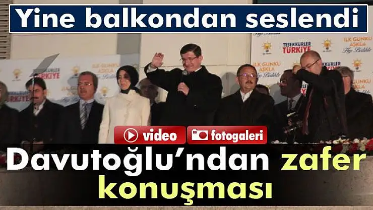 Başbakan Ahmet Davutoğlu, 26. Dönem Milletvekili Genel Seçimleri'nde AK Parti'nin yakaladığı başarı sonrası parti genel merkezinde balkon konuşması yaparak partililere seslendi. Davutoğlu, "İstiklalimizin karargahı, cumhuriyetimizin başkenti, milli iradenin tecelligahatı, aziz Ankara'nın değerli yürekli insanları, kardeşlerim. 81 vilayetimizde şu anda coşkuyla demokrasi bayramı yapan değerli vatandaşlarım, sizleri selamların en güzeliyle selamlıyorum, Allah'ın selamı üzerinize olsun. Bu demokrasi kürsüsünden 78 milyon vatandaşımızın her birine selamlarımızı, muhabbetlerimizi, saygılarımızı sunuyoruz. Kurucu genel başkanımız, halkın doğrudan oylarıyla seçilen ilk Cumhurbaşkanımız Sayın Recep Tayyip Erdoğan bir demokrasi ve uzlaşma şölenine çevirdiği bu balkondan sizlere bir kez daha hitap etmekten büyük bir gurur duyuyorum. İstanbul'a, Diyarbakır'a, Bursa'ya, Şanlıurfa'ya, İzmir'e, Adana'ya, Konya'ya 81 vilayetimize selam olsun. İlk başkentimiz Konya'dan selçuklu başkentinden, Cumhuriyet başkentine geldik sizlere Hz. Mevlana'dan selamlar getirdik. Kendileri gurbette olup da yürekleri burada olan, Rumeli, Üsküp, Saraybosna'da dünyanın dört bir yanında bizleri ekranları başında gözyaşlarıyla dualarıyla izleyen gönüldaşlarımıza selam olsun. Kudüs'ten Beyrut'a, Bakü'den, Gazze'ye, Karadağ'dan Bişkek'e Bağdat'tan Saraybosna'ya kadar gözlerini bu mübarek ülkeye, Türkiye'ye, Türkiye Cumhuriyeti Devleti'ne heyecan içerisinde çeviren bugünkü sonucu bekleyen milyonlarca Türkiye sevdalısına selam olsun. Kaderini Türkiye'nin kaderine bağlamış ellerini semaya çevirmiş hayır dualarını bu kardeşlerini eksik etmeyen, bir buçuk milyarlık İslam alemine selam olsun. bu partinin kurucu genel başkanı Sayın Recep Tayyip Erdoğan'a bir kez daha selam ediyorum" ifadelerini kullandı.