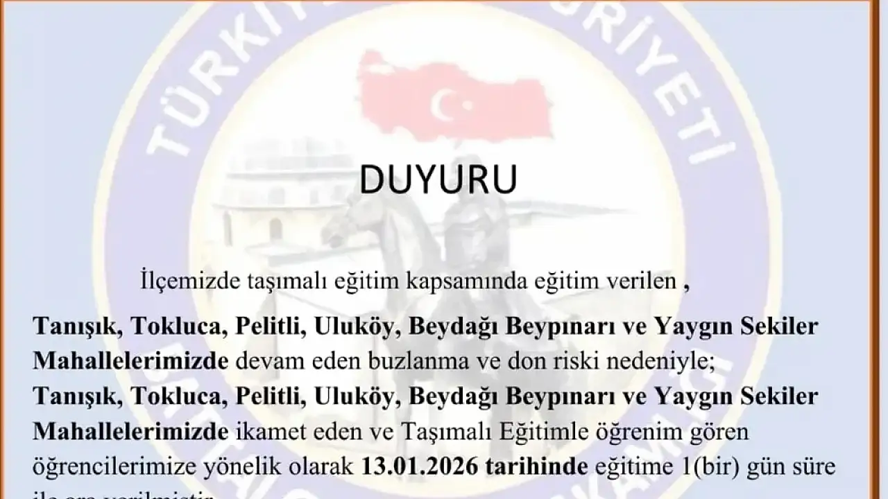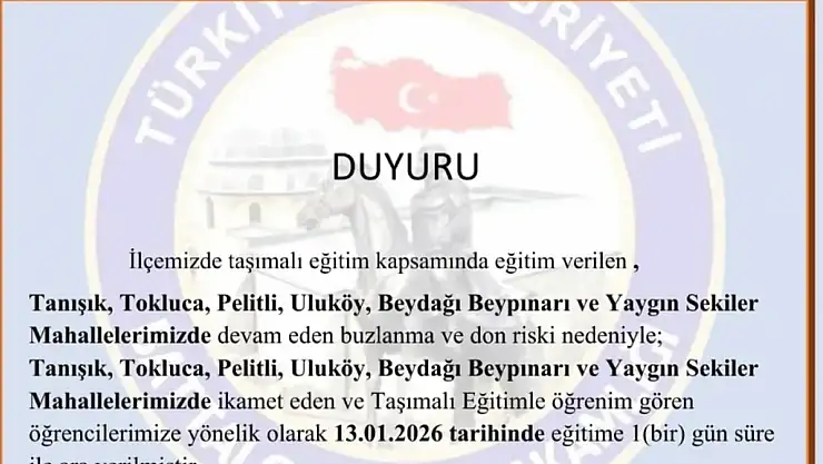 Tanışık, Tokluca, Pelitli, Uluköy, Beydağı Beypınarı ve Yaygın Sekiler Mahallelerimizde ikamet eden ve Taşımalı Eğitimle öğrenim gören öğrencilerimize yönelik olarak 13.01.2026 tarihinde eğitime 1(bir) gün süre ile ara verilmiştir.