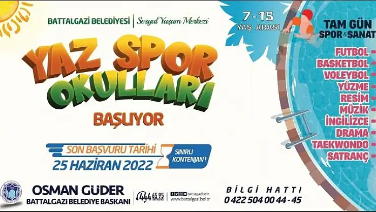 Battalgazi Belediyesi tarafından 7-15 yaş grubu çocukların kültürel açıdan daha donanımlı hale gelmeleri, spor yapmaları ve sosyal aktivitelere katılarak yaz ayını verimli bir şekilde geçirmelerini sağlamak amacıyla 25 Haziran tarihinde Sosyal Yaşam Merkezi´nde kapılarını aralayacak olan Yaz Spor Okulları´nda kayıt süreci devam ediyor.