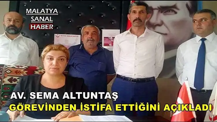 BBP Malatya İl Başkanı Av. Sema Altuntaş, bugün yaptığı basın açıklaması ile BBP Malatya İl Başkanlığı görevinden istifa ettiğini açıkladı. Altuntaş ile birlikte, Battalgazi ve Yeşilyurt İlçe Başkanları da ve yönetimleri de görevinden istifa etti.