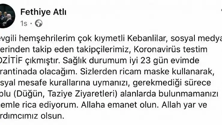 Kovid-19 testi pozitif çıkan Keban Belediye Başkanı Fethiye Atlı, yaptığı açıklamada, "Sevgili hemşehrilerim çok kıymetli Kebanlılar, sosyal medya üzerinden takip eden takipçilerimiz, korona virüs testim pozitif çıkmıştır. Sağlık durumum iyi, 23 gün evimde karantinada olacağım. Sizlerden ricam maske kullanarak, sosyal mesafe kurallarına uymanız, gerekmediği sürece toplu alanlarda bulunmamanızı önemle rica ediyorum. Allah´a emanet olun. Allah yar ve yardımcımız olsun" dedi.