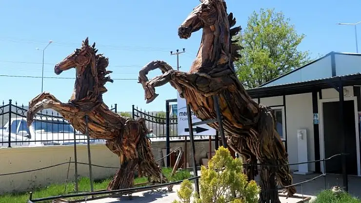 Sivas´ta bulunan, tamamen organik olarak bin atık sedir ağacı parçasından seçilen en uygun parçalarla oluşturulan şaha kalkmış dev at heykelleri görenlerin dikkatini çekiyor.