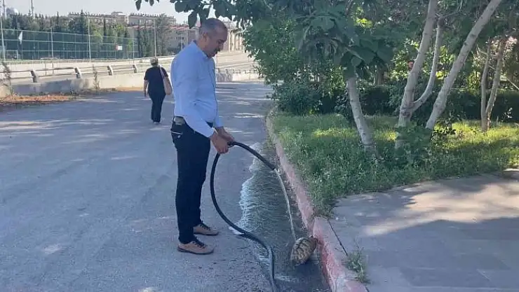 Adıyaman Üniversitesi kampüs alanında ise bir kaplumbağanın susuzluk ve sıcaklar nedeniyle yürümekte güçlük çektiğini fark eden görevli kaplumbağayı hortumla su tutarak serinletti.