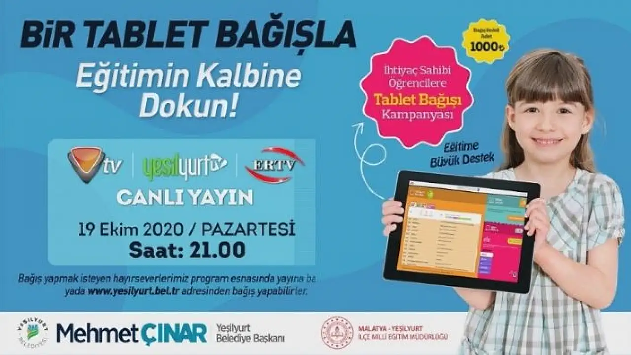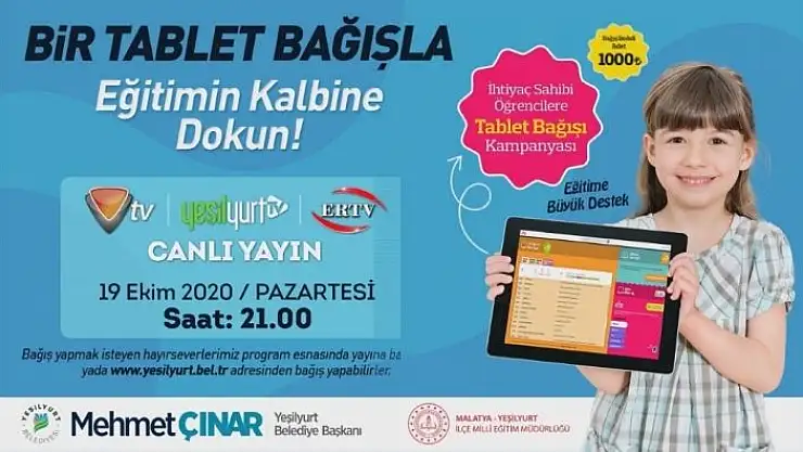 Malatya´nın Yeşilyurt Belediyesinin sosyal sorumluluk projeleri kapsamında düzenlediği, Yeşilyurt İlçe Kaymakamlığı, İl ve İlçe Milli Eğitim Müdürlüklerinin katkı sağladığı `Bir Tablet Bağışla, Eğitimin Kalbine Dokun´ kampanyası için 19 Ekim Pazartesi günü saat 21:00´de canlı yayın yapılacak.