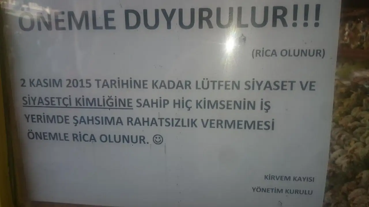Mısır Çarşısında Hediye Kayısı işi yapan esnaf Ali Fuat ÖZDEMİR yazdığı not şöyle: " 2 Kasım 2015 tarihine kadar lütfen siyaset ve siyasetçi kimliğine sahip hiç kimsenin iş yerimde şahsıma rahatsızlık vermemesi rica olunur. Kirvem Kayısı" Özdemir, ekonominin iyiye gitmediğini belirten,akşama kadar oturuyoruz bir de siyasetçilerin tutmayacakları vaatlerini dinlemek istemediğini söyledi. Tepkisinin herhangi bir siyasi partiye olmadığını söyleyen esnaf Özdemir 2 Kasımdan sonra herkes dükkanımızda çay içmeye gelebilir dedi.