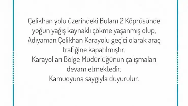 Konu ile ilgili Adıyaman Valiliğinden yapılan açıklamada, "Çelikhan yolu üzerinde bulunan Bulam-2 köprüsünde yoğun yağış kaynaklı çökme yaşanmış olup Adıyaman-Çelikhan karayolu geçici olarak araç trafiğine kapatılmıştır. Karayolları Bölge Müdürlüğünün çalışmaları devam etmektedir" ifadelerine yer verildi.