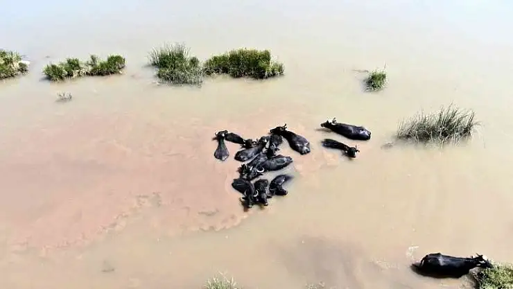 Türkiye genelinde yaşanan sıcak hava dalgası insanlar kadar hayvanları da etkiliyor. Sivas´ta sıcaklardan bunalan mandalar, kendilerini Türkiye´nin en uzun ırmağı Kızılırmak´a atarak serinliyor. Kalın deri yapısı nedeniyle sıcağı oldukça fazla hisseden mandalar, bu sayede hem ferahlıyor hem de temizleniyor. Afrika belgesellerini aratmayan mandaların serinlediği anlar renkli görüntülere sahne oluyor.