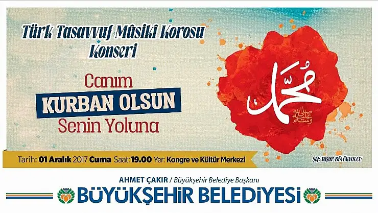 Malatya Kongre ve Kültür Merkezi’nde gerçekleştirilecek konseri, Kültür ve Sosyal İşler Dairesi bünyesindeki Malatya Büyükşehir Belediyesi Türk Tasavvuf Musikisi Korosu verecek. “Canım Kurban Olsun Senin Yoluna” adlı konser, 1 Aralık 2017 Cuma günü saat 19.00’da başlayacak.