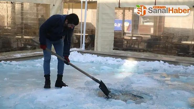 Sivas’ta hava sıcaklığının sıfırın altında 15 dereceye düşmesiyle vatandaşlar buz tutan süs havuzunun yüzeyini kürek ve çekiçle kırdılar.