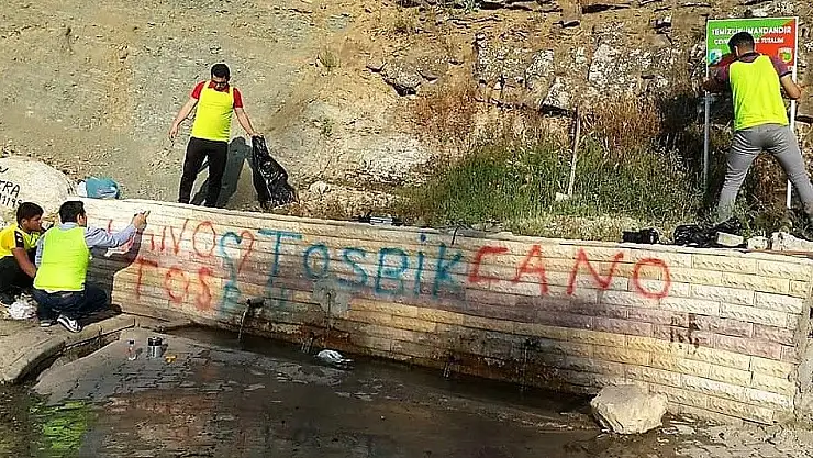Kahramanmaraş’ta duvar yazılarına tepki gösteren bir grup gönüllü vatandaş, bir çeşmenin duvarını boyadı.