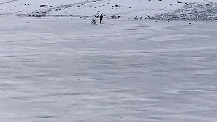 Sivas´ta büyük bir tehlikeyi göze alarak bisikleti ile donan gölün yüzeyinde yürüyen kişi görüntülendi.