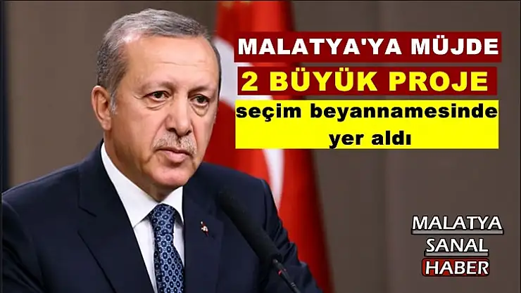 Cumhurbaşkanı Erdoğan, seçim beyannamesinde yer alan önemli kalkınma projelerini açıkladı. Cumhurbaşkanlığı Seçimleri ve Genel Seçimler Seçim Beyannamesi kitapçığında yer alan önemli kalkınma projelerinin, bazıları Malatya’yı da ilgilendiren kısmı şöyle: