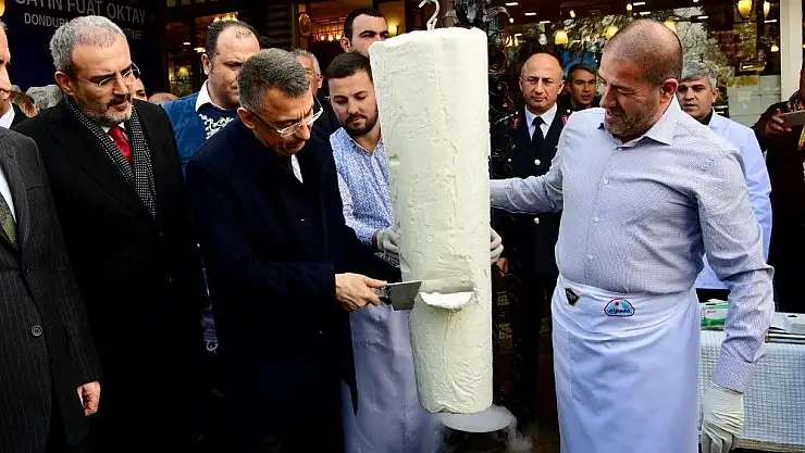 Cumhurbaşkanı Yardımcısı Fuat Oktay, Kahramanmaraş’ta satırla Maraş dondurması kesti.