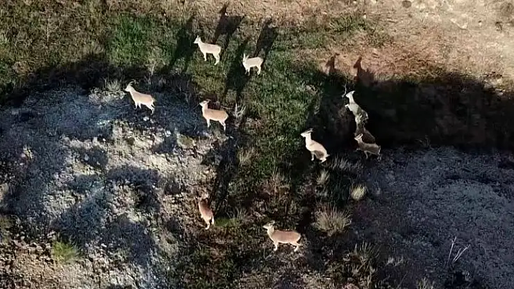 Sivas´ta bir doğa tutkunu, dağlık alanda gezdiği sırada fark ettiği 10 tane yaban keçisini dron ile kayıt altına aldı.Sivas´ın Şark