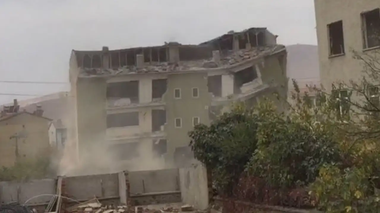 Elazığ´da depremde hasar gören yapıların yıkımı kent genelinde sürerken, 5 katlı iki binanın ekiplerin kontrollü yıkım çalışmasında çökme anı kameraya yansıdı.