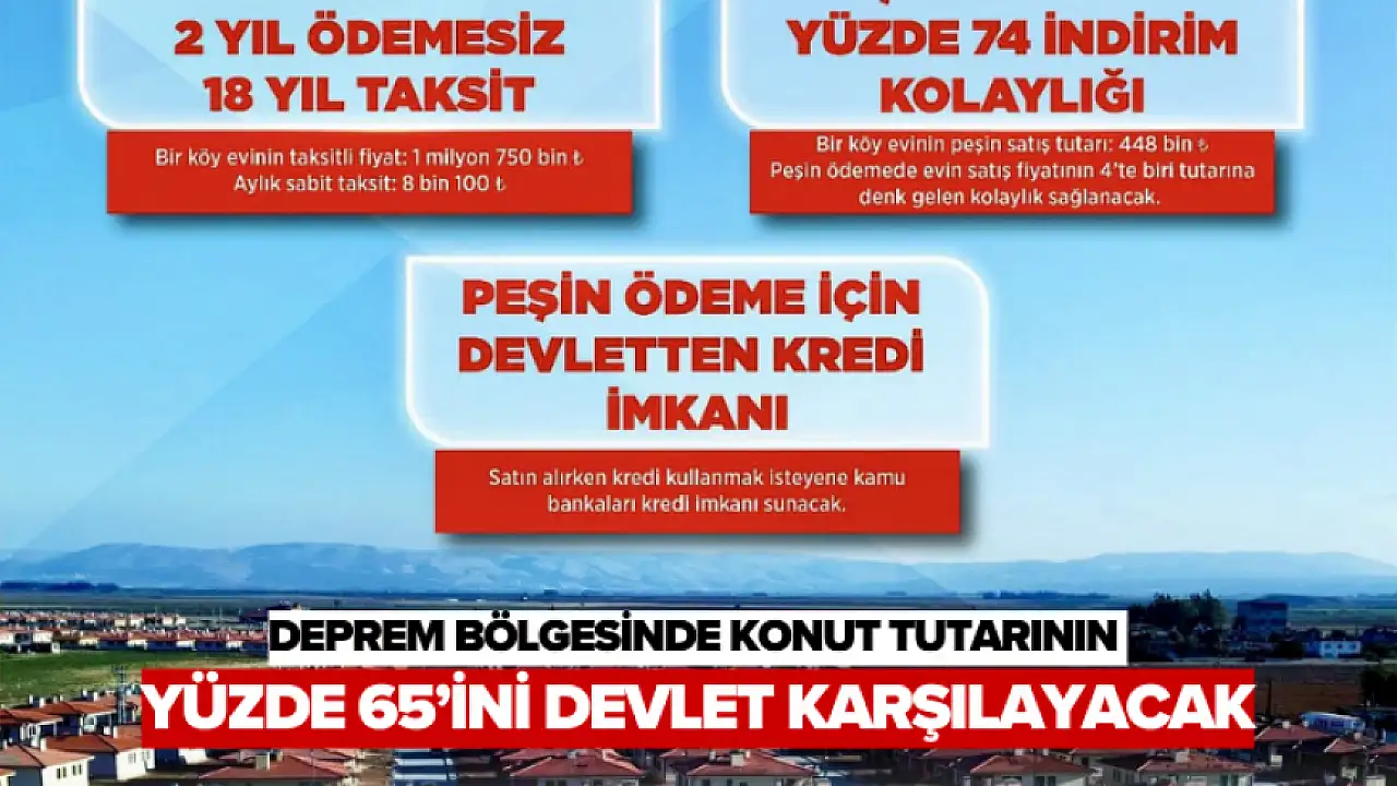 Öte yandan köy evleri için de benzer bir destek modelinin uygulanacağı belirtilen paylaşımda, köy evlerinin aylık sabit taksidinin 8 bin 100 TL olacağı aktarıldı.