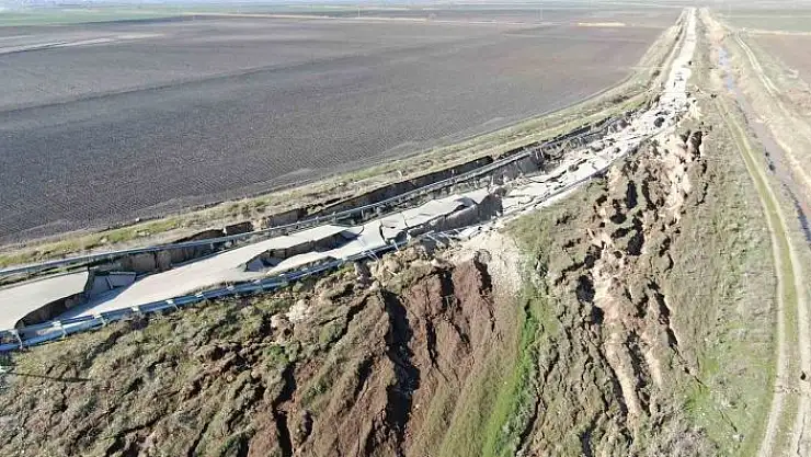 Kahramanmaraş´ta depremin büyüklüğünü gözler önüne seren otobanın üzerinden geçen bağlantı yolu çevresinde oluşan devasa çatlak havadan görüntülendi.