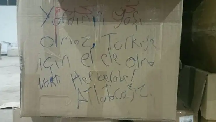 Kahramanmaraş´ta meydana gelen depremler nedeniyle vatandaşlar tarafından gönderilen yardım paketlerinden duygu dolu notlar çıkıyor.Türk