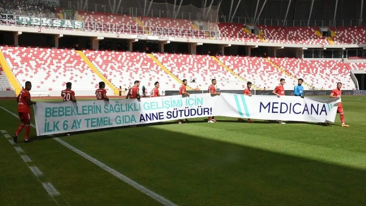 Demir Grup Sivasspor, Bursaspor müsabakasına anne sütü farkındalığı adına 1-7 Ekim Emzirme Haftası’nda ’Bebeklerin sağlıklı gelişimi için ilk 6 ay temel gıda anne sütüdür’ Medicana pankartı ile sahaya çıktı.