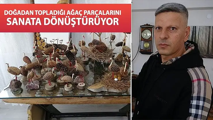 - Doğadan topladığı ağaç parçalarını sanata dönüştürüyor