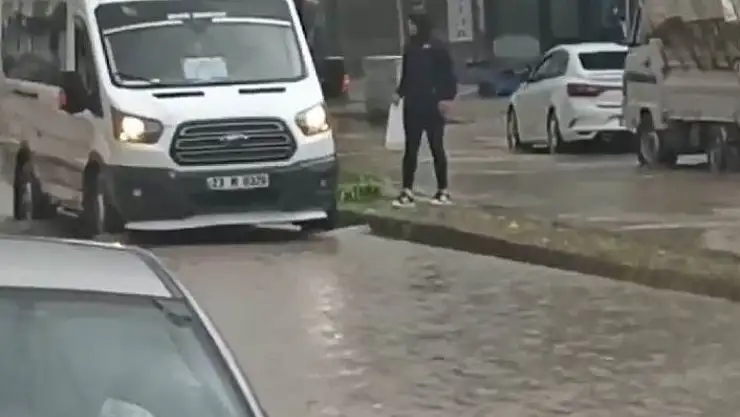 Elazığda dolmuş şoförü, dün aniden bastıran sağanak yağış nedeni ile yağmur sularının ortasında kalan yolcuyu, araçtan inip kendi kapısından dolmuşa ald