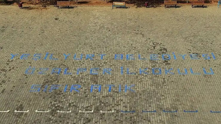 Erken yaşlarda ‘çevre ve insan’ sağlığının korunmasının önemini fark eden duyarlı öğrenciler tarafından biriktirilen mavi plastik şişe kapaklarla okulun bahçesindeki ön kısma ‘Yeşilyurt Belediyesi Özalper İlkokulu Sıfır Atık’ yazıldı.