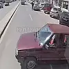 Sivas’ta el freni çekilmeyen otomobil refüje çarparak durabildi. O anlar halk otobüsünün güvenlik kamerası tarafından kaydedildi.