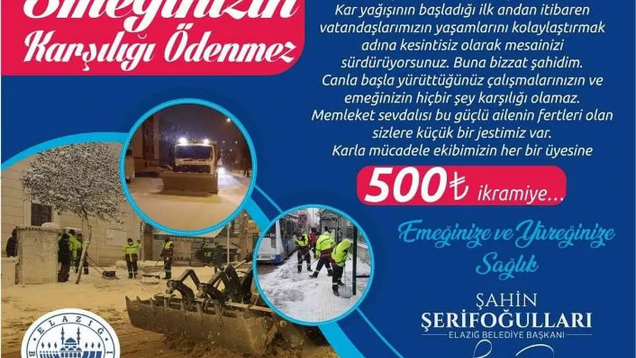 Elazığ Belediyesi, karla mücadele çalışmalarında görev alan ekiplere ikramiye verileceğini açıkladı.