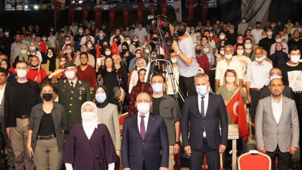 Programda konuşan Vali Erkaya Yırık, Türkiye´nin bölünmez bütünlüğünü, milli birlik ve beraberliği parçalamaya yönelik gerçekleştirilen 15 Temmuz hain darbe girişiminin milletin eşine az rastlanır bir kahramanlık örneği ile bertaraf edildiğini söyledi. Vali Yırık, ´´5´inci yılında bir taraftan memleketimizin 251 yiğit evladını bir gecede kaybetmenin hüznünü tekrar yaşarken diğer taraftan da dünyada eşine az rastlanır şanlı bir zafere şahit olmanın gururunu yaşıyoruz. Hüzün ve gururun aynı anda yaşandığı bu gecede aziz şehrimizin 9 evladı da kalplerinde iman ve milli ruh ile şehadet şerbetini içmiştir. Aziz şehitlerimiz bu memleketin kahraman evlatları bayrağı, vatanı, devleti ve milletiyle bu toprakların geçilemez olduğunu bir kez daha göstererek Türkiye geçilmez demiştir. Fatih Sultan Mehmet´in, Alparslan´ın, Yavuz Sultan Selim´in, Ulu Batlı Hasan´ın, Mustafa Kemal Atatürk´ün ve daha nicelerinin ruhlarının yok olduğunu mu zannediyorsunuz? Onların ruhları bu kahraman milletin bedeninde halen diridir. Aziz milletimiz Fetullahçı Terör Örgütü tarafında planlı olarak gerçekleştirilen bu hain darbe girişimine karşı tek yürek olup tıpkı Çanakkale´de Kurtuluş Savaşında olduğu gibi vatan ve bayrak aşkı ile karşı koyarak adeta çelikten bir set oluşturmuştur. Ülkemizin birlik ve beraberliği ile milletimizin geleceğine kast edenlere milli irade geçilmez demiştir´´ dedi.