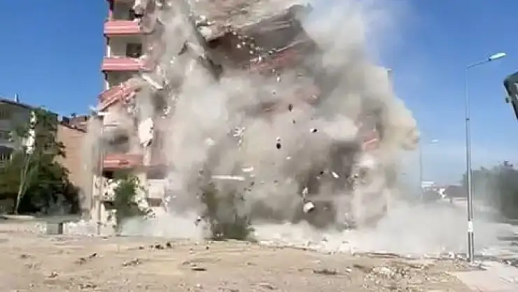 6 Şubat´ta Kahramanmaraş´ta meydana gelen yıkıcı depremlerden etkilenen iller arasından bulunan Elazığ´da ağır hasarlı binaların yıkımı devam ediyor. Bu çerçevede, merkeze bağlı Akpınar Mahallesinde yıkımına başlanan 6 katlı bina, iş makinesinin makasını vurmasıyla bir anda yerle bir oldu. Ortalık toz bulutu ile kaplanırken o anlar cep telefonu kamerasına saniye saniye yansıdı.