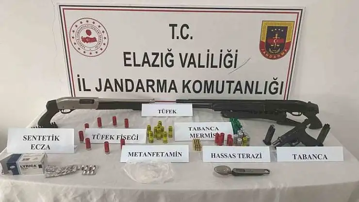 İş yerinde yapılan aramada, 21 gram metamfetamin, 7 adet Lyrıca hap, 1 adet hassas tartı, 2 adet ruhsatsız pompalı tüfek, 1 adet ruhsatsız tabanca, 32 adet tabanca fişeği, ve 13 adet av tüfeği fişeği ele geçirildi.