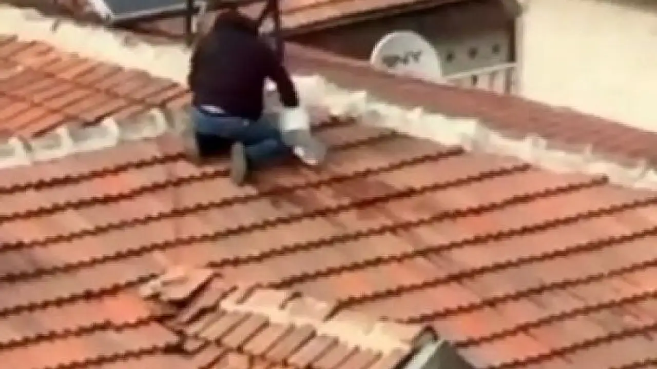 Elazığ´da bir kişinin çatıda tehlikeli yürüyüşü yürekleri ağza getirdi. O anlar cep telefonu kamerasına yansıdı.